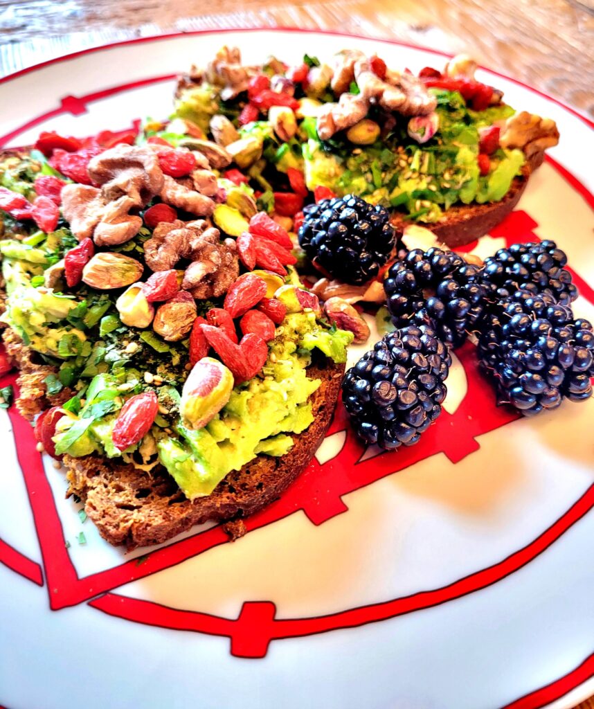 Freshly baked high protein sprouted nut and seed sourdough topped with mashed organic avocado, fresh parsley, cilantro and mint, microgreens, goji berries, pistachios, and raw walnuts. Plump sweet blackberries top off your antioxidant, protein rich breakfast.