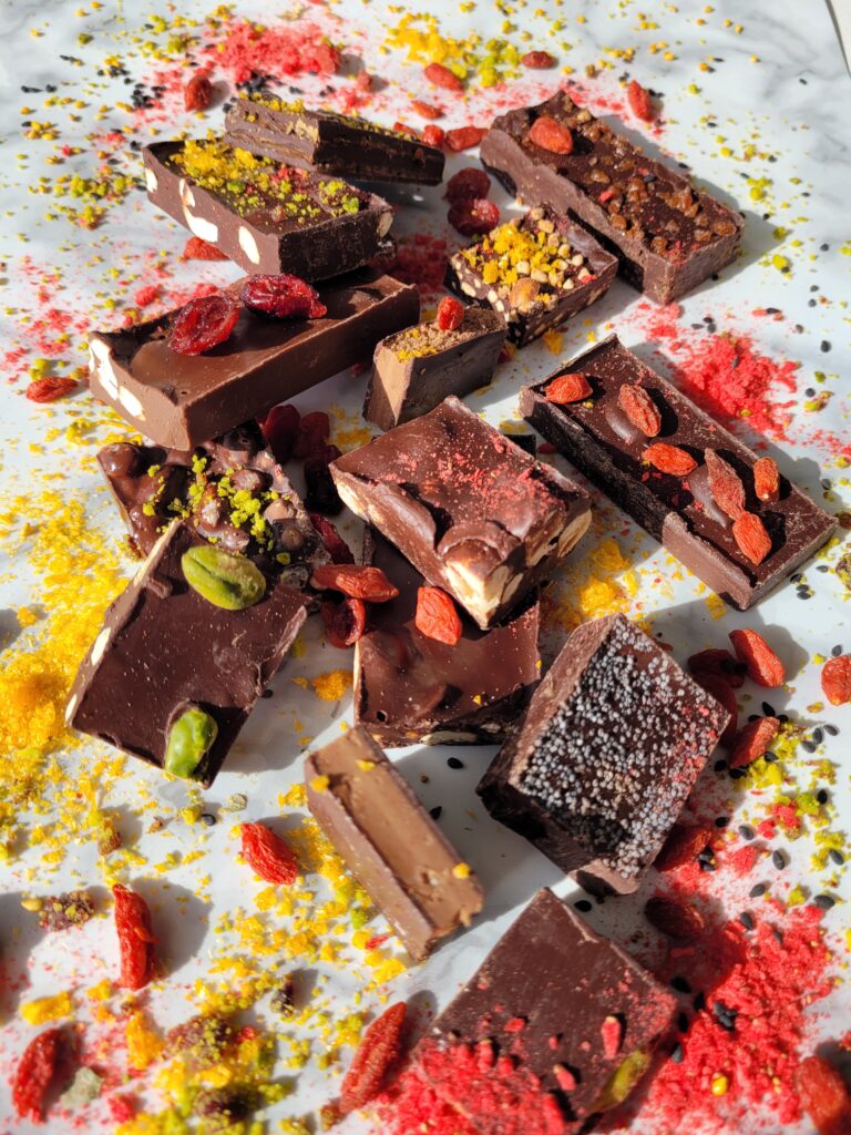 Handmade Dark Chocolates, Gogi, Mandarin, Strawberry Hazelnut, Pistachio, Pecan and Chia. Delicious and Dairy Free.