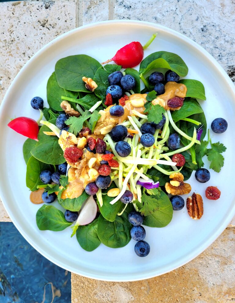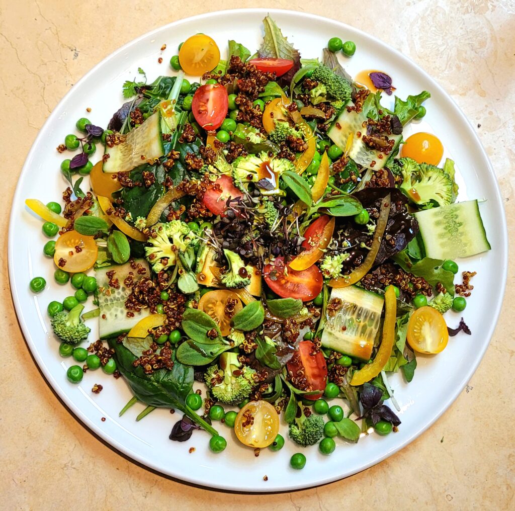 Pumpkin microgreens, nutty quinoa, broccoli florets, cucumber, grape tomatoes, yellow peppers and baby green peas, on a bed of fresh powerful greens topped with herbed balsamic vinaigrette.
