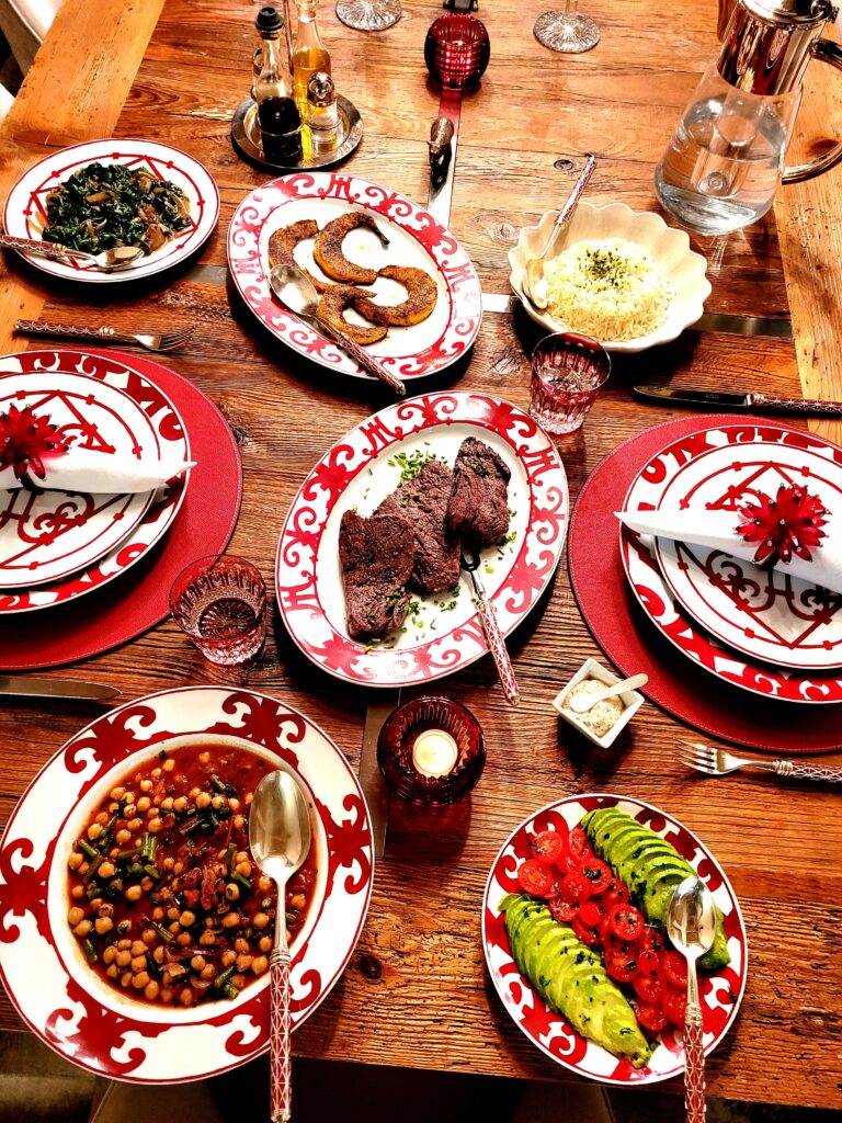 Grilled Wagyu Filet Feast. Stewed Garbanzo Beans, Roasted Pumpkin, Sauteed Spinach, Avocado Tomato Cucumber Salad, and Saffron Rice.