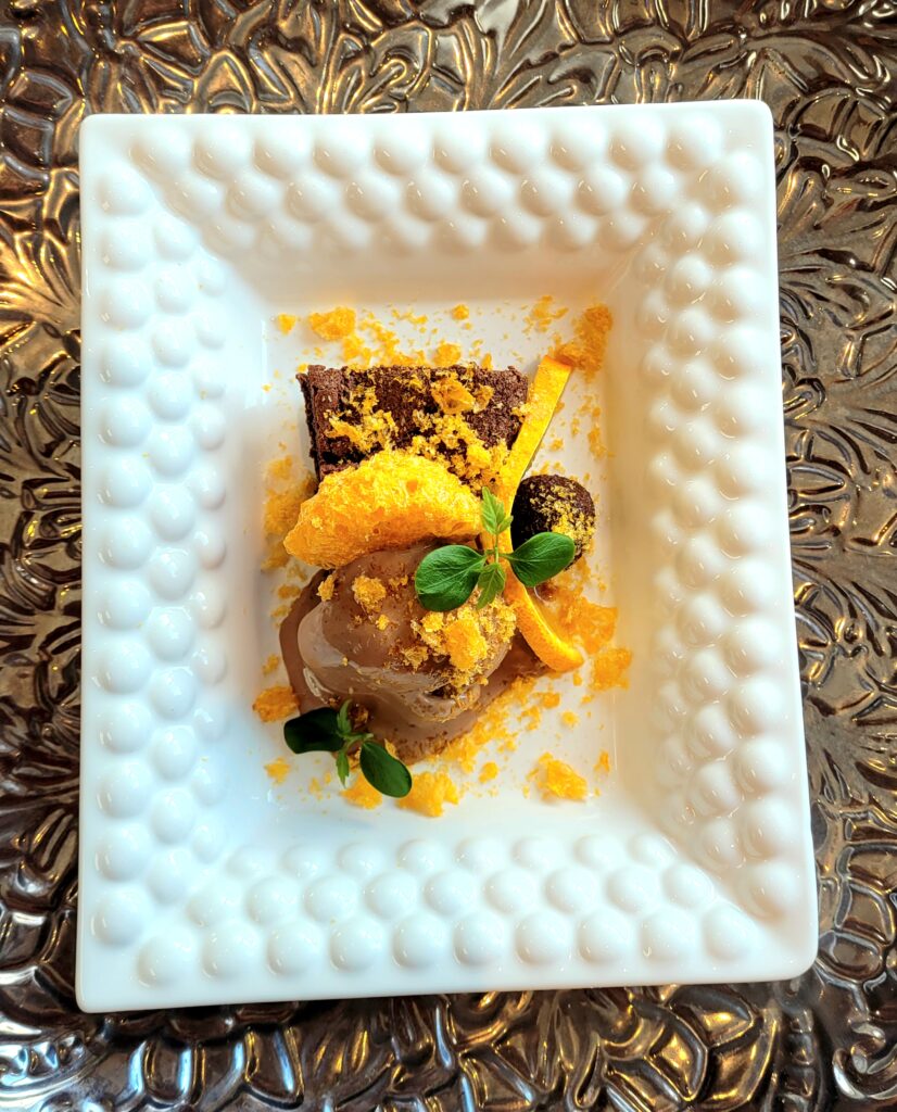 Homemade Chocolate Gelato, Flourless Chocolate Cake, Mandarin Crisp. Brigadeiro.