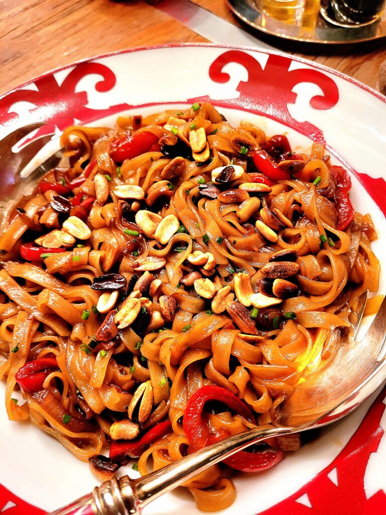 Tamarind Ginger Garlic Pad Thai Noodles with Roasted Red Peppers and Toasted Peanuts .