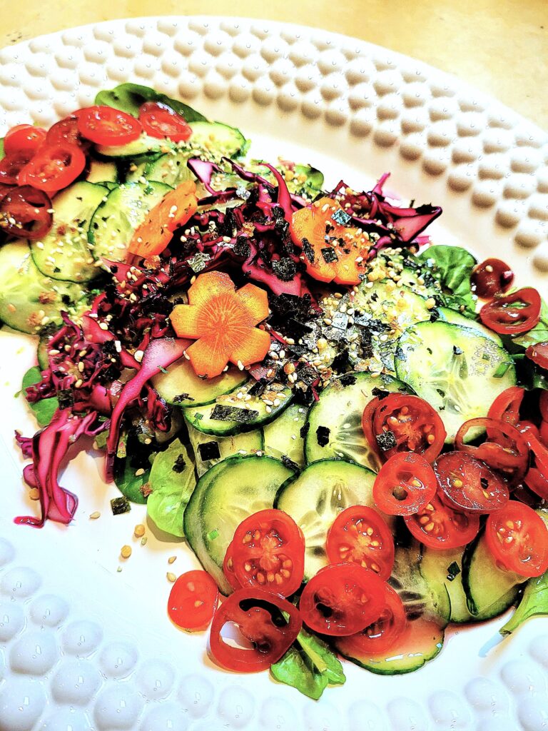 Thinly sliced cucumbers, cherry tomatoes, on a bed of greens, with rice wine vinegar pickled red cabbage, toasted sesame seeds, wasabi, crumbled nori, and carrot flowers.