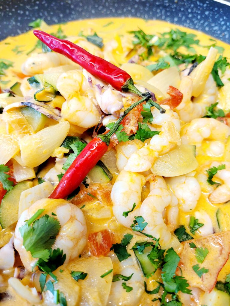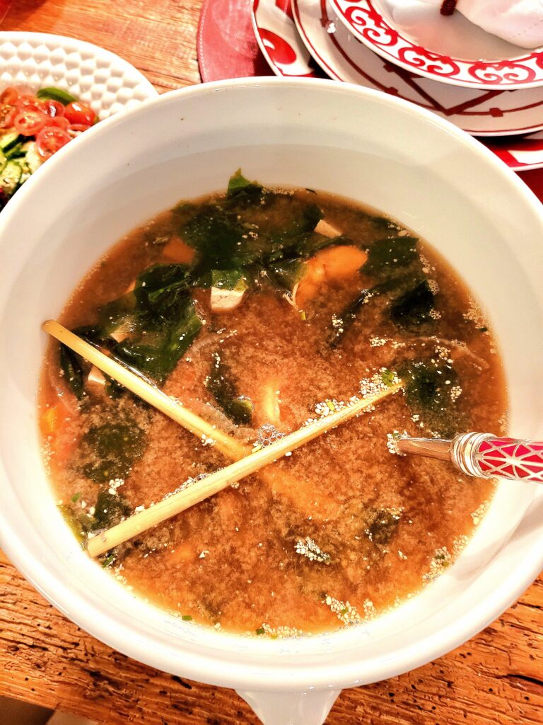 Tom Yum Sea Soup with Tofu, Prawns, Lemongrass, Galangal, Kafir Lime, and Seaweed.