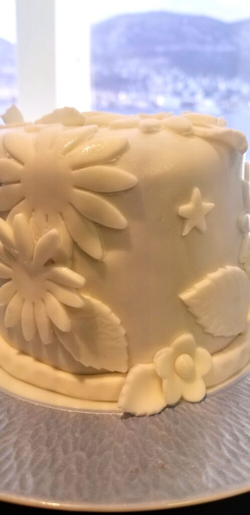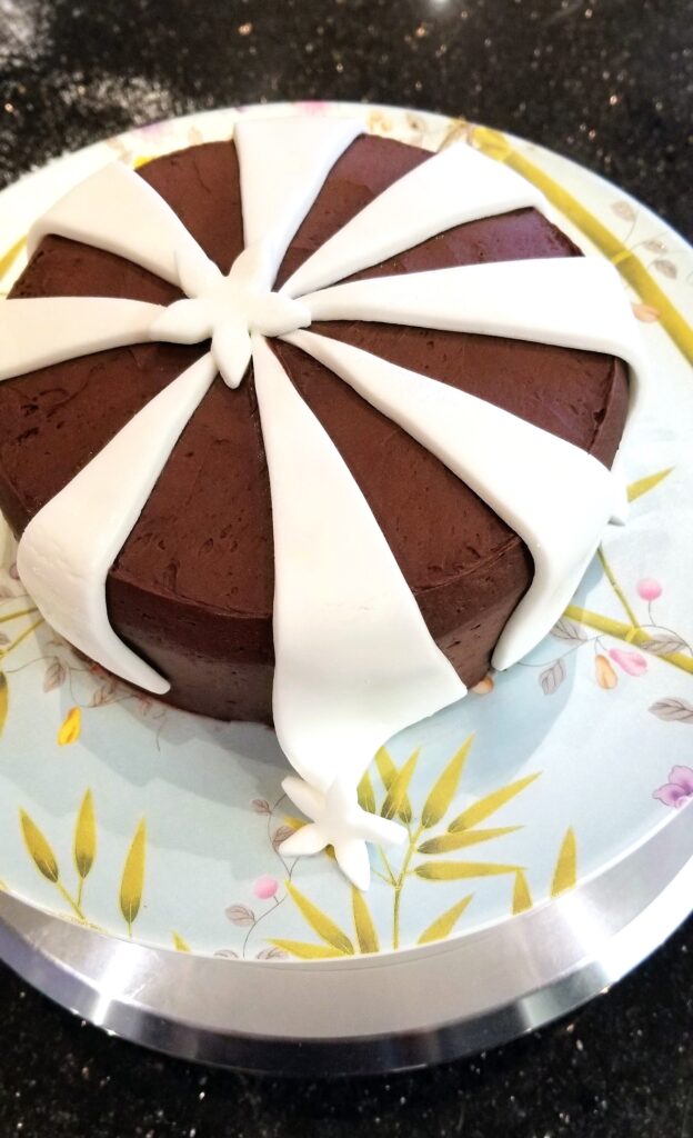 Vegan Chocolate Layer Cake, Strawberry Filled, White Fondant Floral.