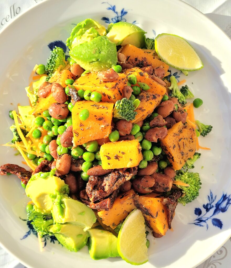 Vegetable protein packed, roasted pumpkin, tempeh, pinto beans, sundried tomatoes, avocado, raw broccoli, shredded carrots, baby peas, lime.