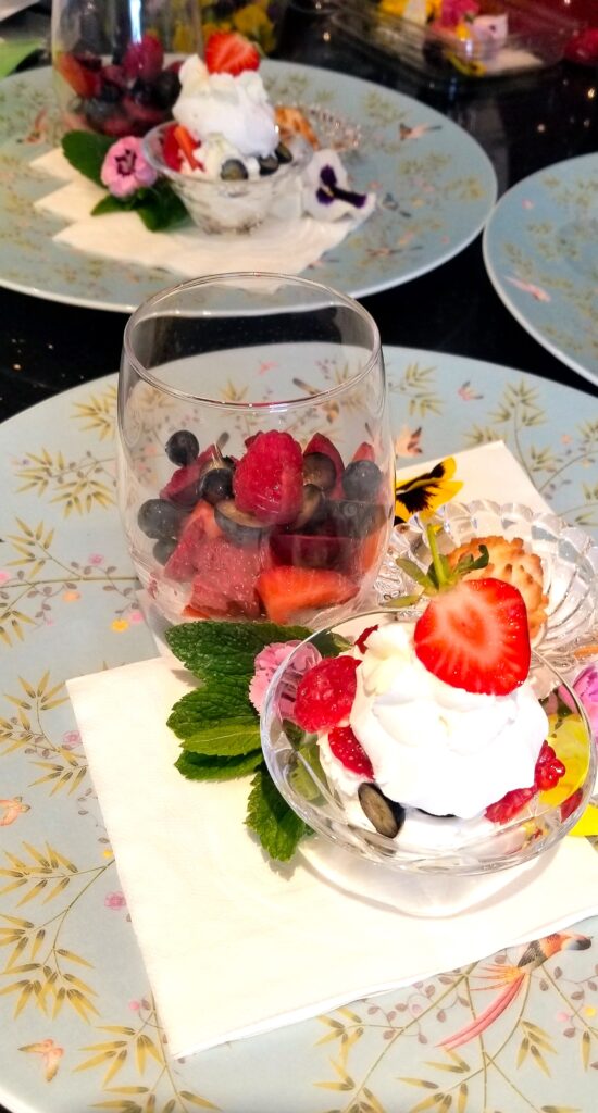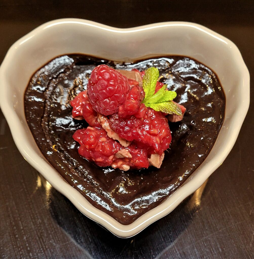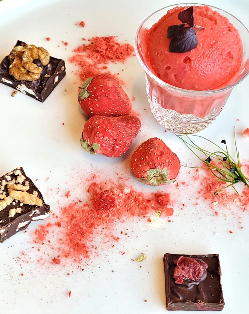 Pure Raspberry Sorbet, DF SF, Freeze Dried Whole Strawberries, Chocolate Nut Bites.