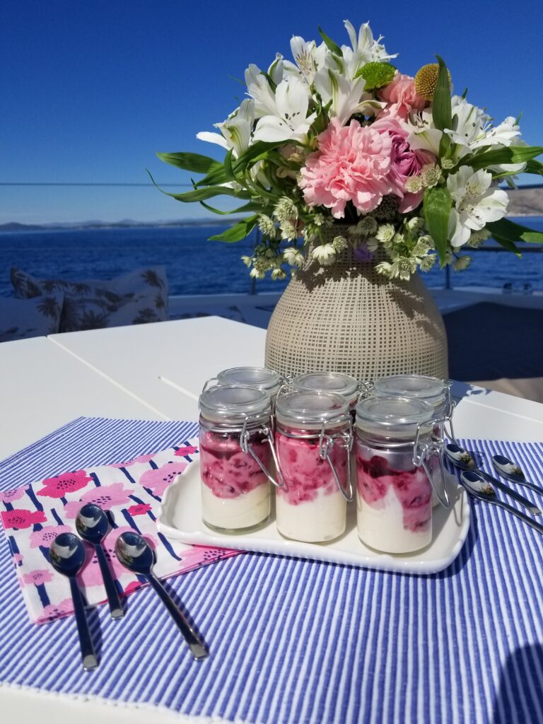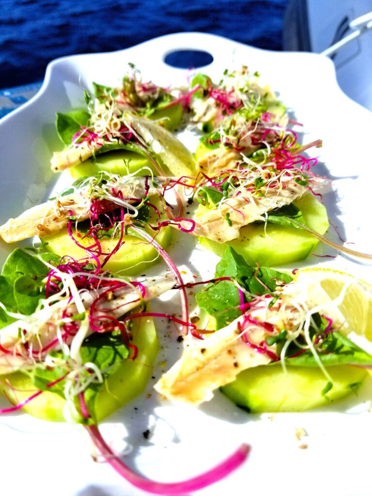 Catch of the day smoked on yacht, cucumber, beet microgreens, baby red chard.