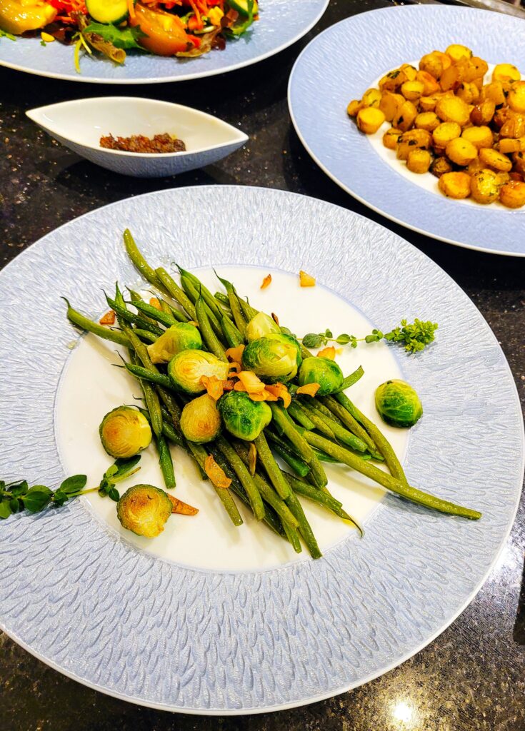 Brussel Sprouts and young green beans. Itsy-bitsy oven roasted baby potatoes.