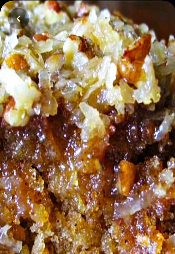 Rich Moist German Chocolate Cake with Pecan Coconut Frosting.
