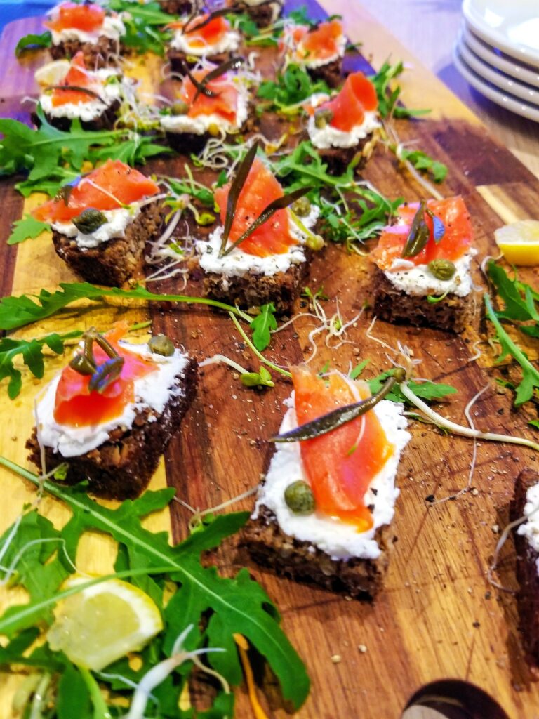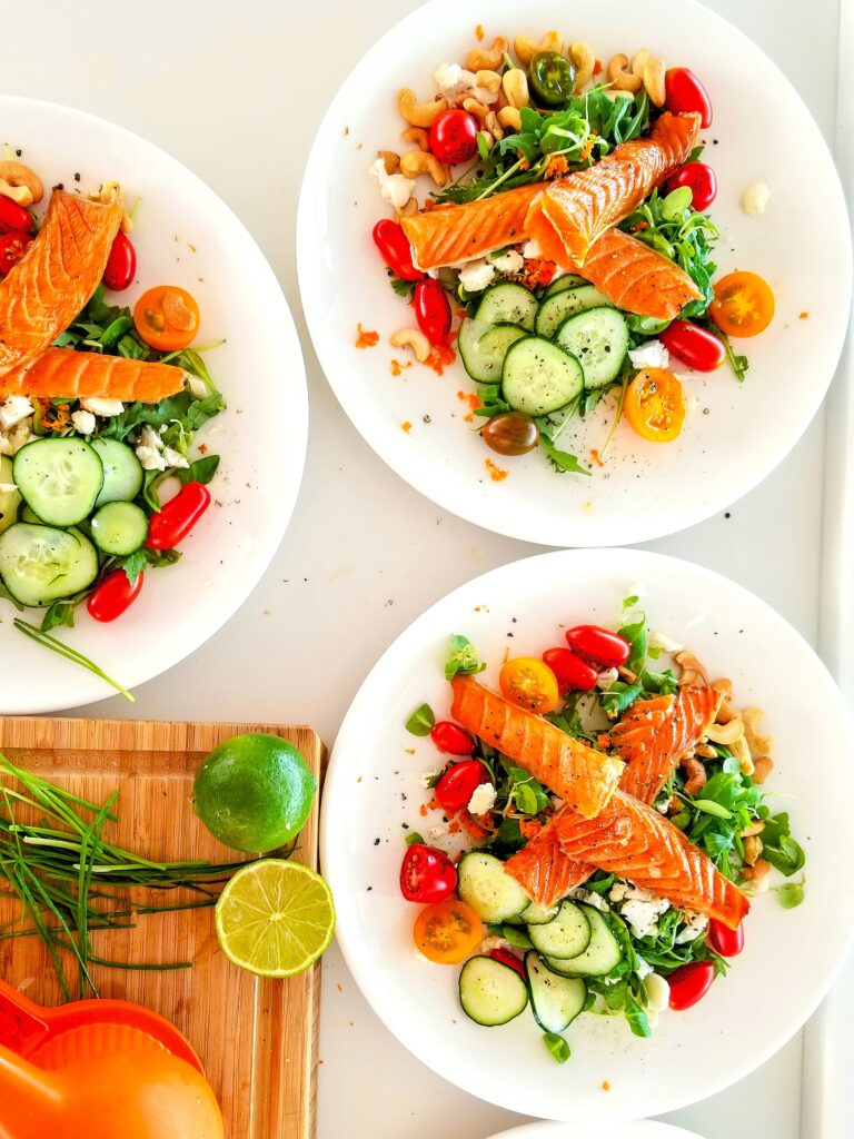 Fish protein, cruciferous greens, seeded healthy fats, whole grains. Salmon, caper, whipped lemon tahini, arugula, sea greens.