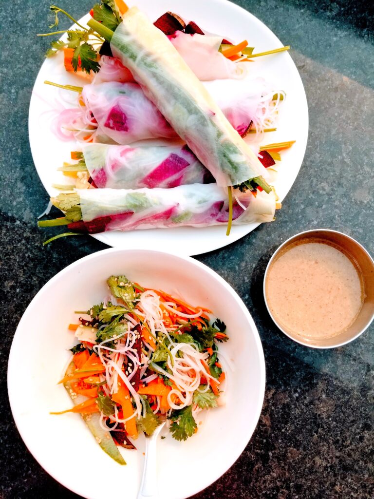 Spring rolls, tofu stuffed with fresh mint, beets, green beans, carrots, cucumber, bean sprouts, basil leaves. Peanut sauce. Spring roll salad.