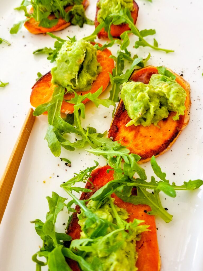 Pan seared sweet potato rounds, guacamole, arugula, cracked pepper, flaky sea salt.