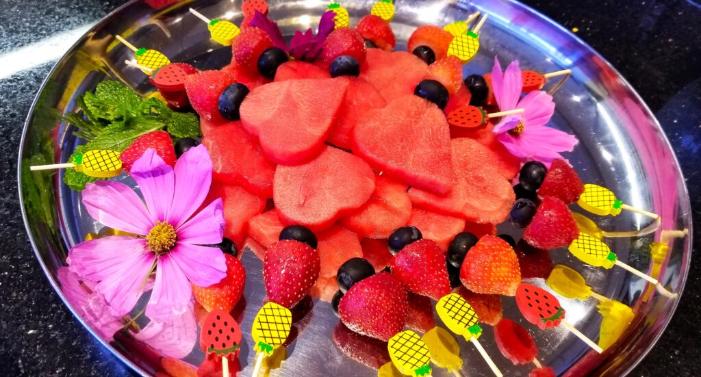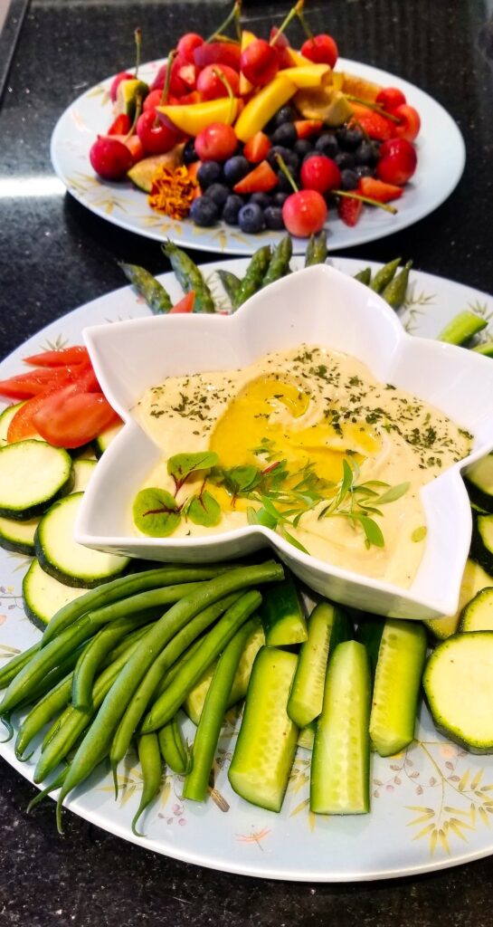 Mashed chick peas crudites with fresh lime and tahini. Summer fruits.